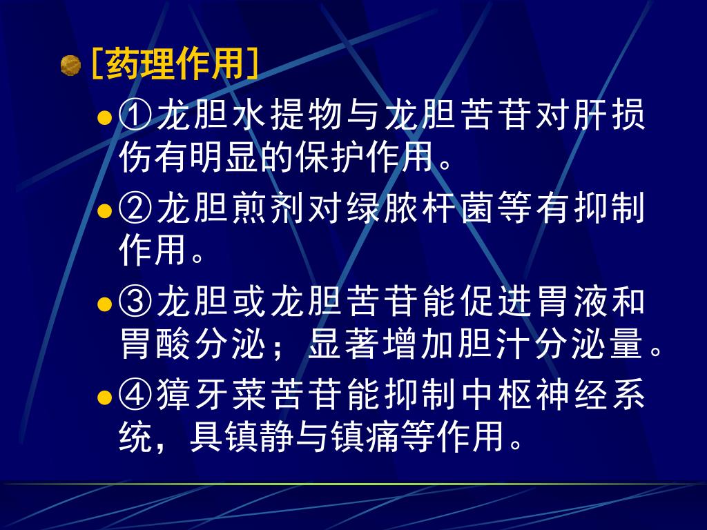 [药理作用] • ①龙胆水提物与龙胆苦苷对肝损伤有明显的保护作用。 • ②龙胆煎剂对绿脓杆菌等有抑制作用。 • ③龙胆或龙胆苦苷能促进胃液和胃酸分泌;显著增加胆汁分泌量。 • ④獐牙菜苦苷能抑制中枢神经系统,具镇静与镇痛等作用。