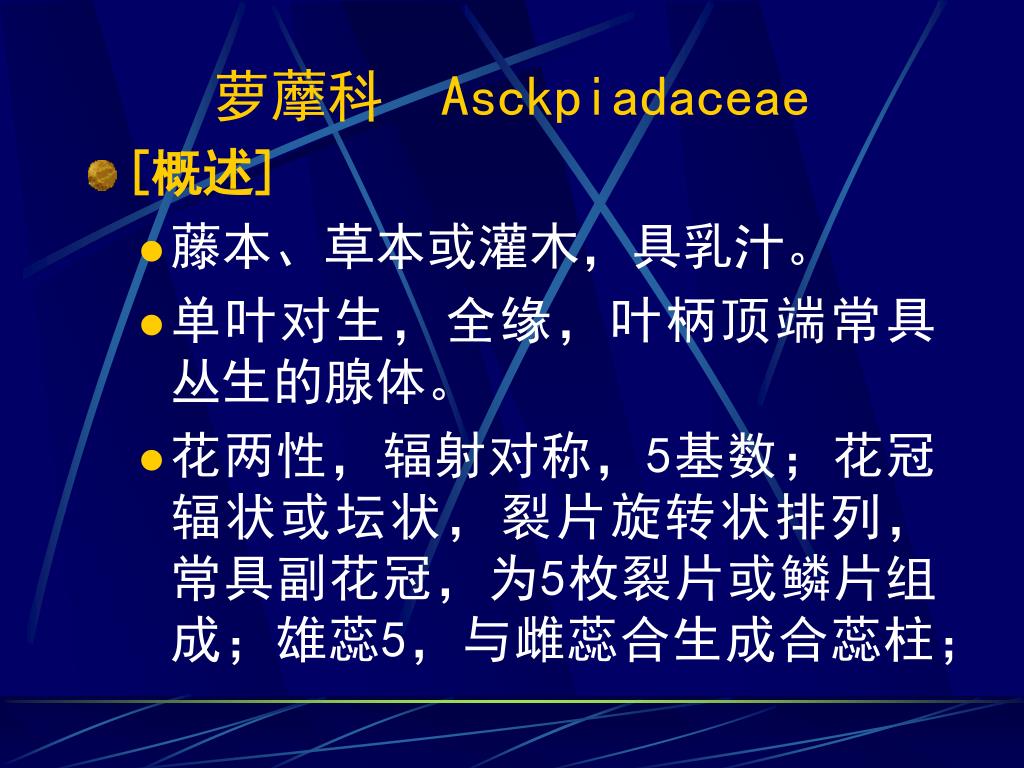 萝藦科 Asckpiadaceae • [概述] • 藤本、草本或灌木,具乳汁。 • 单叶对生,全缘,叶柄顶端常具丛生的腺体。 • 花两性,辐射对称,5基数;花冠辐状或坛状,裂片旋转状排列,常具副花冠,为5枚裂片或鳞片组成;雄蕊5,与雌蕊合生成合蕊柱;