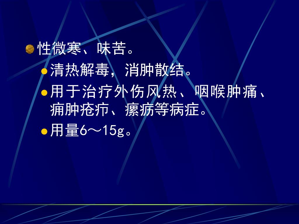 性微寒、味苦。 • 清热解毒,消肿散结。 • 用于治疗外伤风热、咽喉肿痛、痈肿疮疖、瘰疬等病症。 • 用量6~15g。