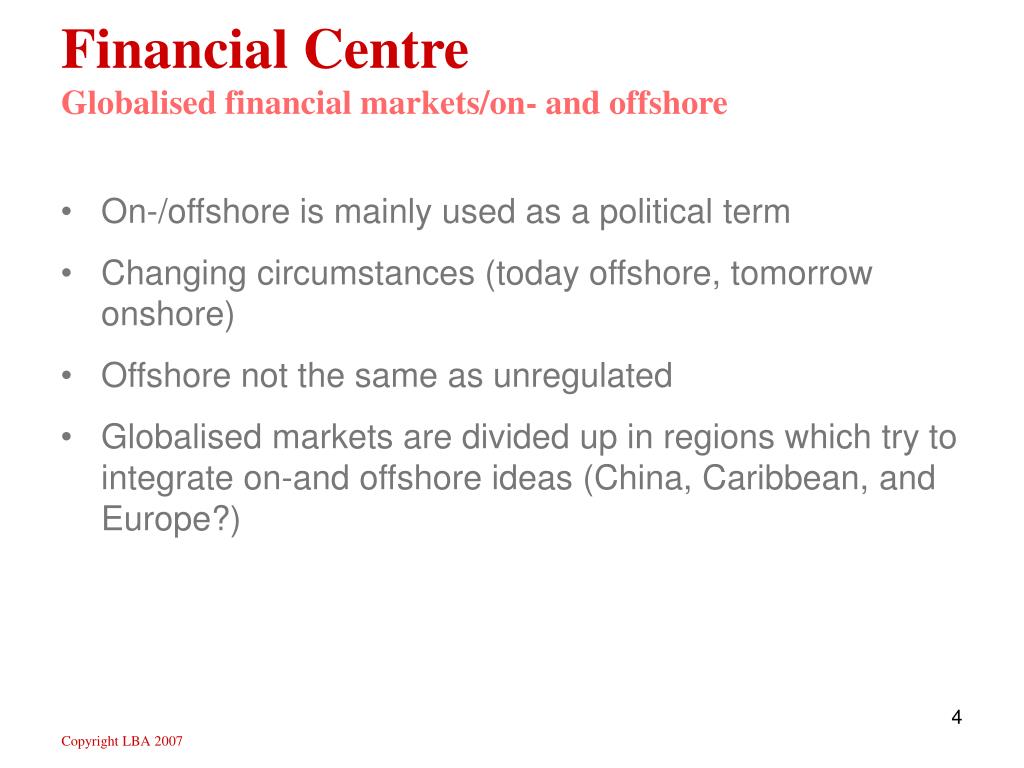 Financial Centre Globalised financial markets/on- and offshore • On-/offshore is mainly used as a political term • Changing circumstances (today offshore, tomorrow onshore) • Offshore not the same as unregulated • Globalised markets are divided up in regions which try to integrate on-and offshore ideas (China, Caribbean, and Europe?)