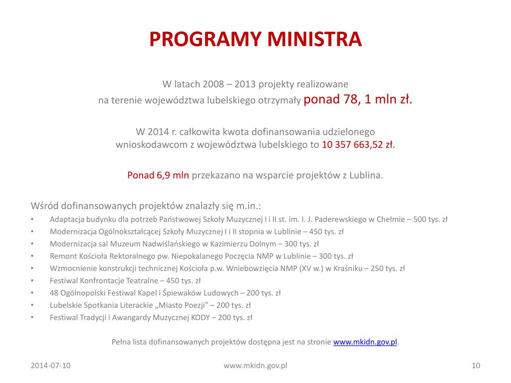 PROGRAMY MINISTRA W latach 2008 – 2013 projekty realizowane na terenie województwa lubelskiego otrzymały ponad 78, 1 mln zł. W 2014 r. całkowita kwota dofinansowania udzielonego wnioskodawcom z województwa lubelskiego to 10 357 663,52 zł. Ponad 6,9 mln przekazano na wsparcie projektów z Lublina. Wśród dofinansowanych projektów znalazły się m.in.: • Adaptacja budynku dla potrzeb Państwowej Szkoły Muzycznej I i II st. im. I. J. Paderewskiego w Chełmie – 500 tys. zł • Modernizacja Ogólnokształcącej Szkoły Muzycznej I i II stopnia w Lublinie – 450 tys. zł • Modernizacja sal Muzeum Nadwiślańskiego w Kazimierzu Dolnym – 300 tys. zł • Remont Kościoła Rektoralnego pw. Niepokalanego Poczęcia NMP w Lublinie – 300 tys. zł • Wzmocnienie konstrukcji technicznej Kościoła p.w. Wniebowzięcia NMP (XV w.) w Kraśniku – 250 tys. zł • Festiwal Konfrontacje Teatralne – 450 tys. zł • 48 Ogólnopolski Festiwal Kapel i Śpiewaków Ludowych – 200 tys. zł • Lubelskie Spotkania Literackie „Miasto Poezji” – 200 tys. zł • Festiwal Tradycji i Awangardy Muzycznej KODY – 200 tys. zł Pełna lista dofinansowanych projektów dostępna jest na stronie www.mkidn.gov.pl. www.mkidn.gov.pl