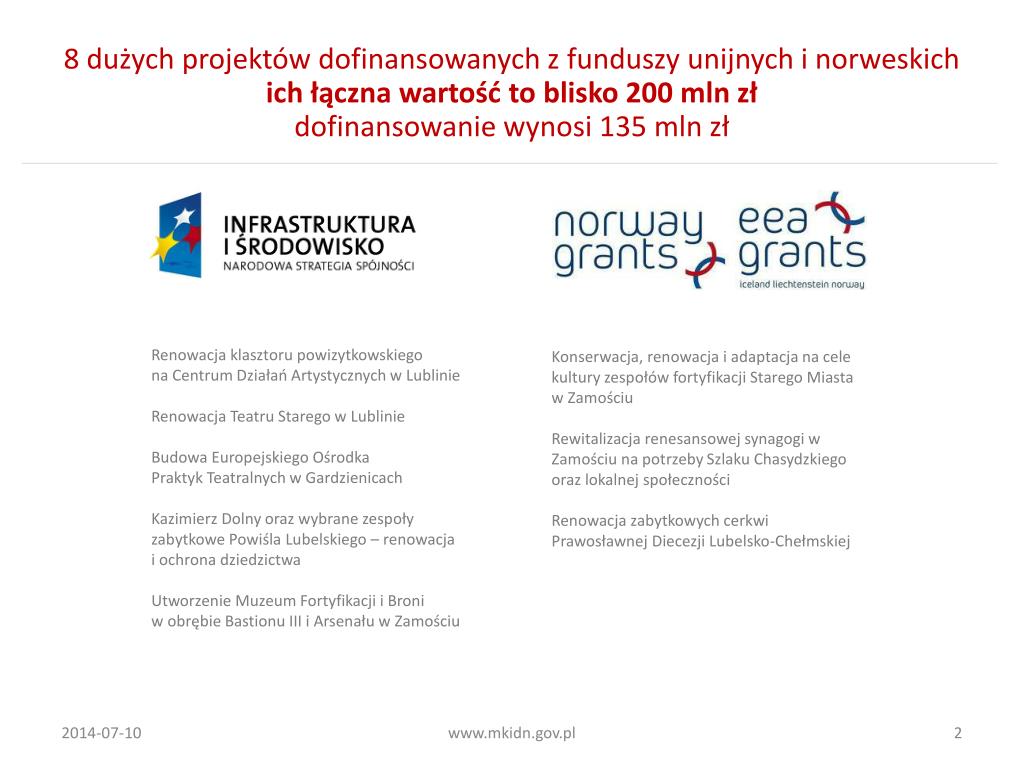 8 dużych projektów dofinansowanych z funduszy unijnych i norweskich ich łączna wartość to blisko 200 mln złdofinansowanie wynosi 135 mln zł Renowacja klasztoru powizytkowskiegona Centrum Działań Artystycznych w Lublinie Renowacja Teatru Starego w Lublinie Budowa Europejskiego Ośrodka Praktyk Teatralnych w Gardzienicach Kazimierz Dolny oraz wybrane zespoły zabytkowe Powiśla Lubelskiego – renowacja i ochrona dziedzictwa Utworzenie Muzeum Fortyfikacji i Broni w obrębie Bastionu III i Arsenału w Zamościu Konserwacja, renowacja i adaptacja na cele kultury zespołów fortyfikacji Starego Miasta w Zamościu Rewitalizacja renesansowej synagogi w Zamościu na potrzeby Szlaku Chasydzkiego oraz lokalnej społeczności Renowacja zabytkowych cerkwi Prawosławnej Diecezji Lubelsko-Chełmskiej www.mkidn.gov.pl