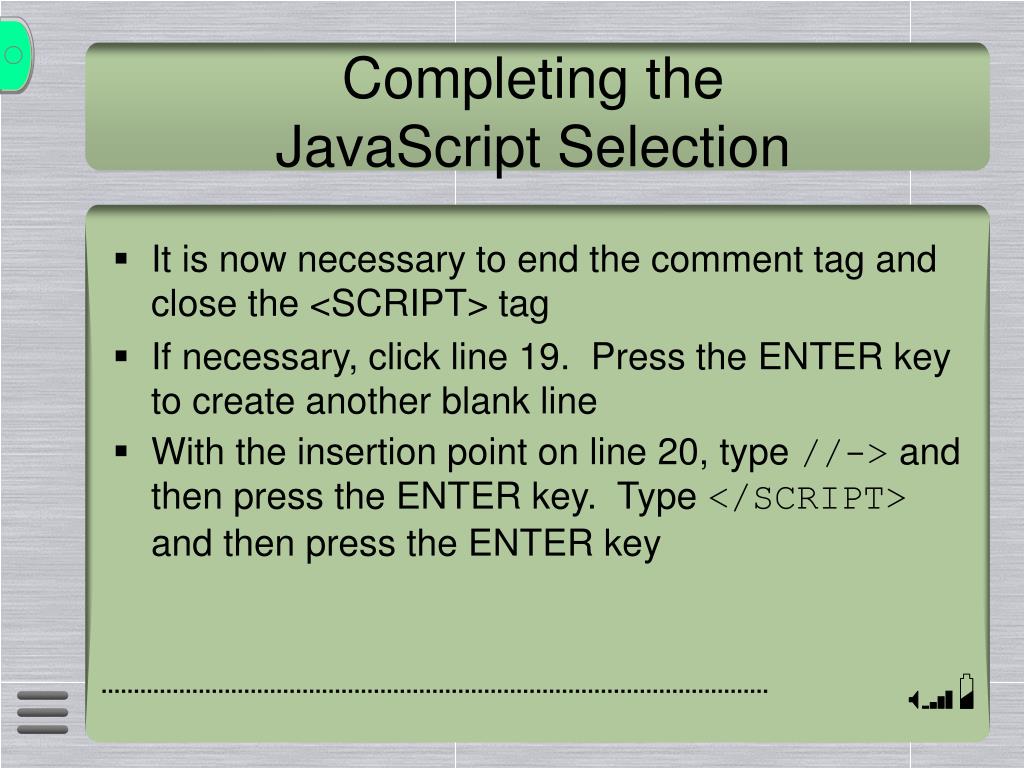 Completing the JavaScript Selection • It is now necessary to end the comment tag and close the <SCRIPT> tag • If necessary, click line 19. Press the ENTER key to create another blank line • With the insertion point on line 20, type //-> and then press the ENTER key. Type </SCRIPT> and then press the ENTER key