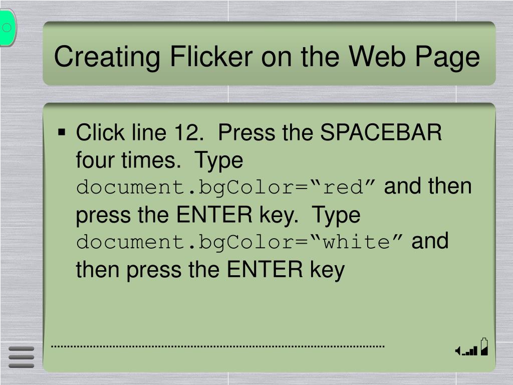 Creating Flicker on the Web Page • Click line 12. Press the SPACEBAR four times. Type document.bgColor=“red” and then press the ENTER key. Type document.bgColor=“white” and then press the ENTER key