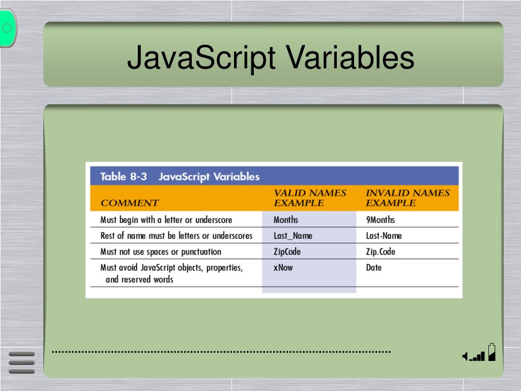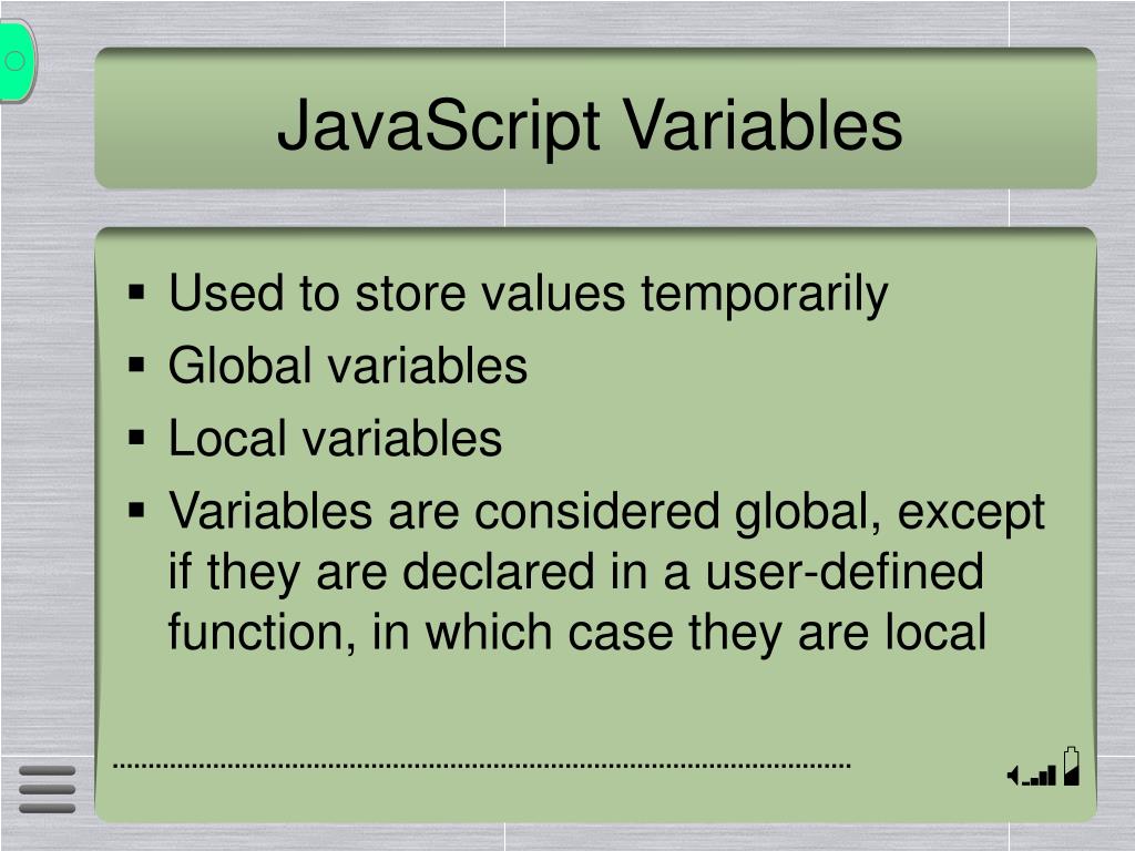 JavaScript Variables • Used to store values temporarily • Global variables • Local variables • Variables are considered global, except if they are declared in a user-defined function, in which case they are local