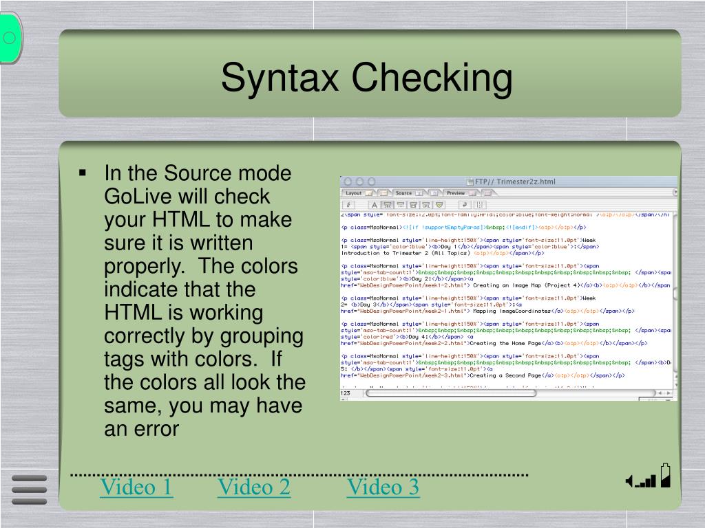 Syntax Checking • In the Source mode GoLive will check your HTML to make sure it is written properly. The colors indicate that the HTML is working correctly by grouping tags with colors. If the colors all look the same, you may have an error Video 1 Video 2 Video 3