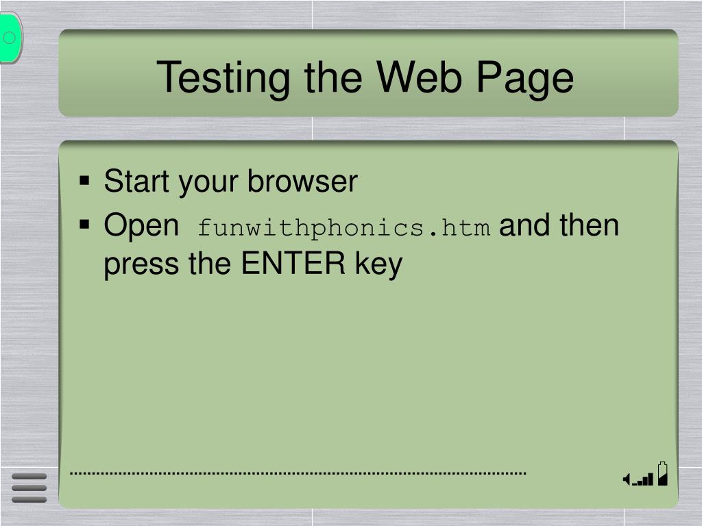 Testing the Web Page • Start your browser • Open funwithphonics.htm and then press the ENTER key