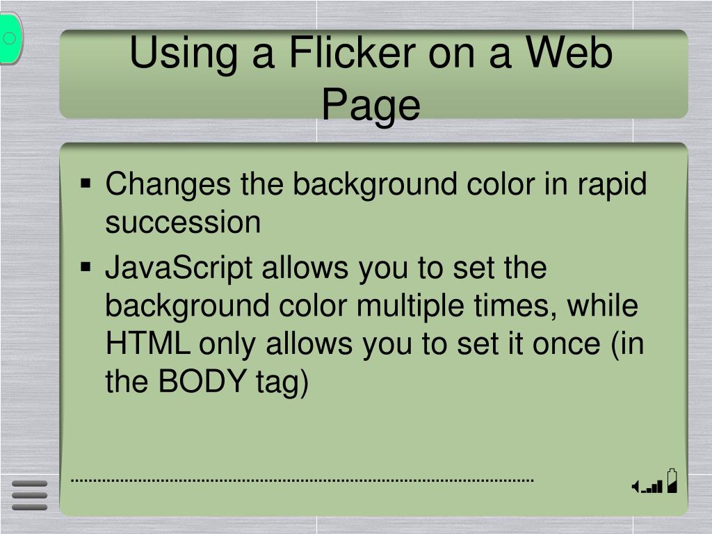Using a Flicker on a Web Page • Changes the background color in rapid succession • JavaScript allows you to set the background color multiple times, while HTML only allows you to set it once (in the BODY tag)