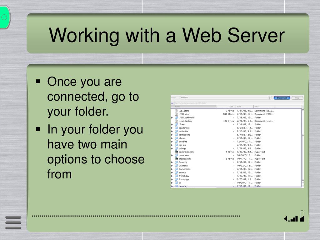 Working with a Web Server • Once you are connected, go to your folder. • In your folder you have two main options to choose from