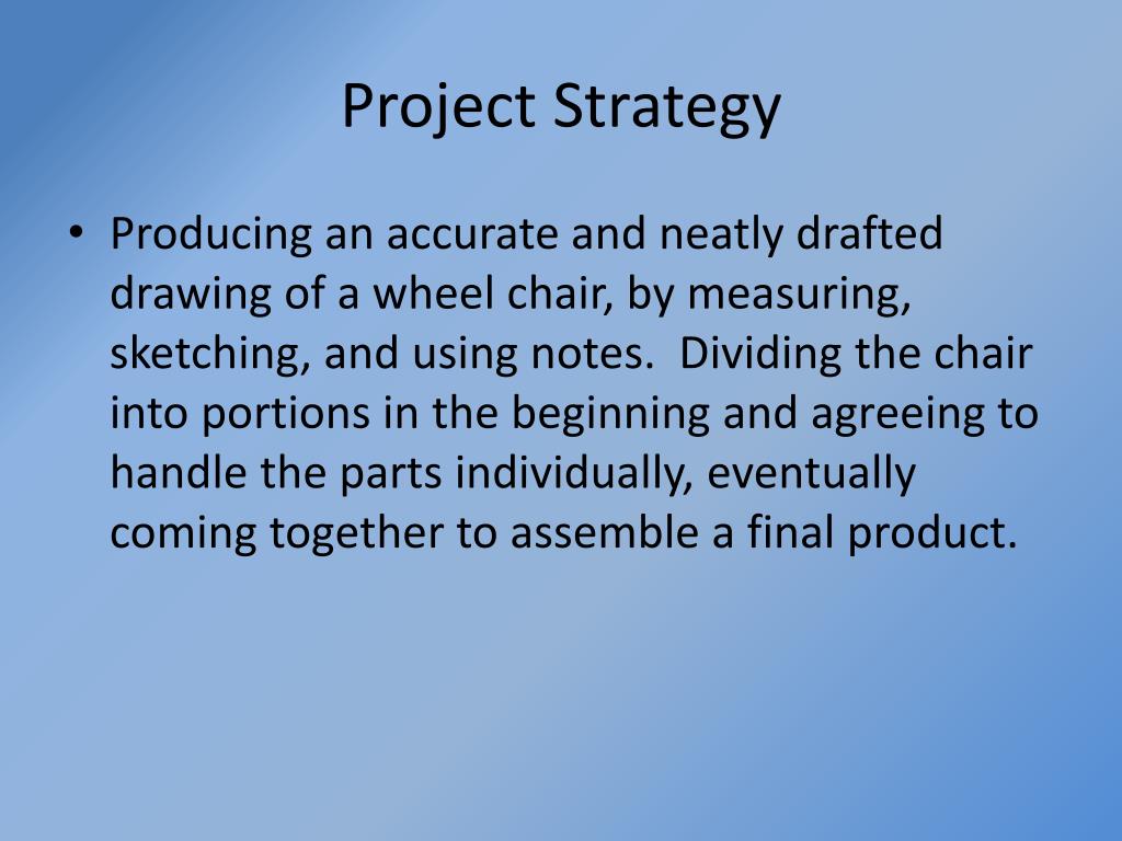 Project Strategy • Producing an accurate and neatly drafted drawing of a wheel chair, by measuring, sketching, and using notes. Dividing the chair into portions in the beginning and agreeing to handle the parts individually, eventually coming together to assemble a final product.