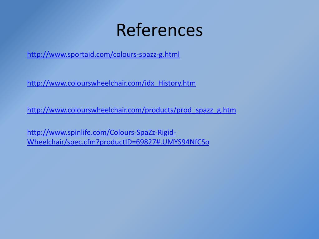 References http://www.sportaid.com/colours-spazz-g.html http://www.colourswheelchair.com/idx_History.htm http://www.colourswheelchair.com/products/prod_spazz_g.htm http://www.spinlife.com/Colours-SpaZz-Rigid-Wheelchair/spec.cfm?productID=69827#.UMYS94NfCSo