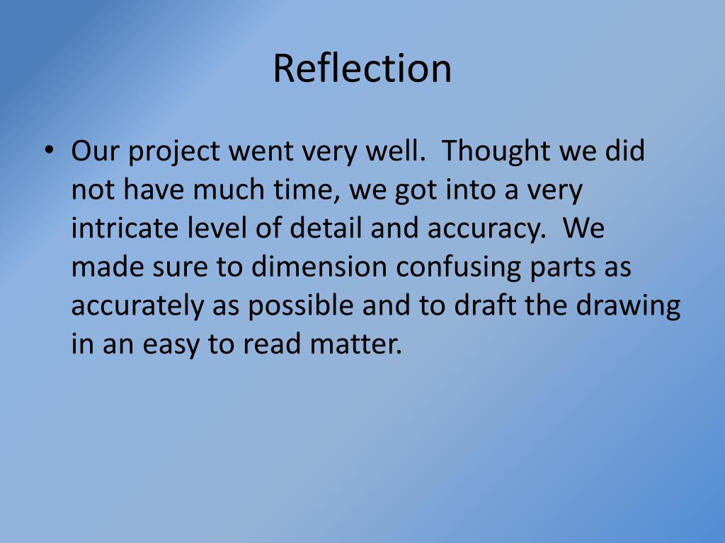Reflection • Our project went very well. Thought we did not have much time, we got into a very intricate level of detail and accuracy. We made sure to dimension confusing parts as accurately as possible and to draft the drawing in an easy to read matter.