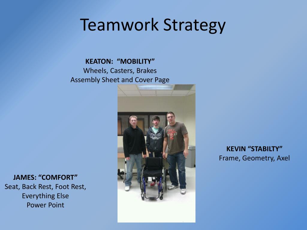 Teamwork Strategy KEATON: “MOBILITY” Wheels, Casters, Brakes Assembly Sheet and Cover Page KEVIN “STABILTY” Frame, Geometry, Axel JAMES: “COMFORT” Seat, Back Rest, Foot Rest, Everything Else Power Point