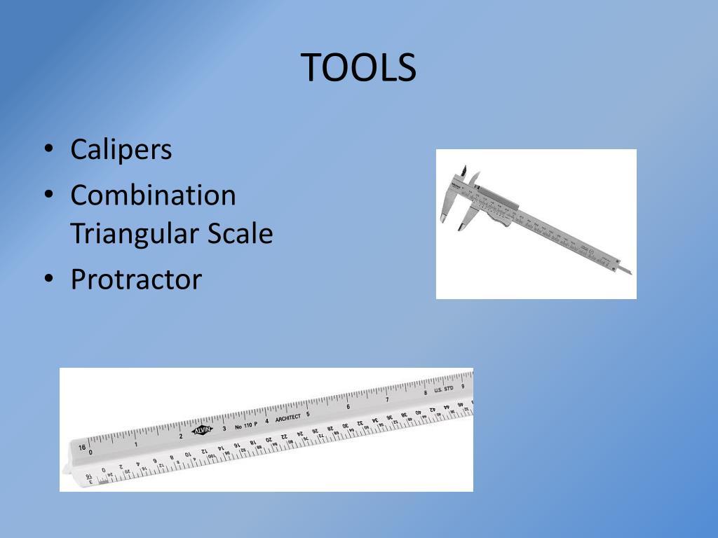 TOOLS • Calipers • Combination Triangular Scale • Protractor