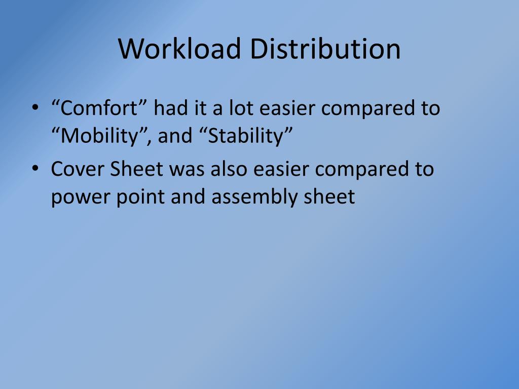 Workload Distribution • “Comfort” had it a lot easier compared to “Mobility”, and “Stability” • Cover Sheet was also easier compared to power point and assembly sheet