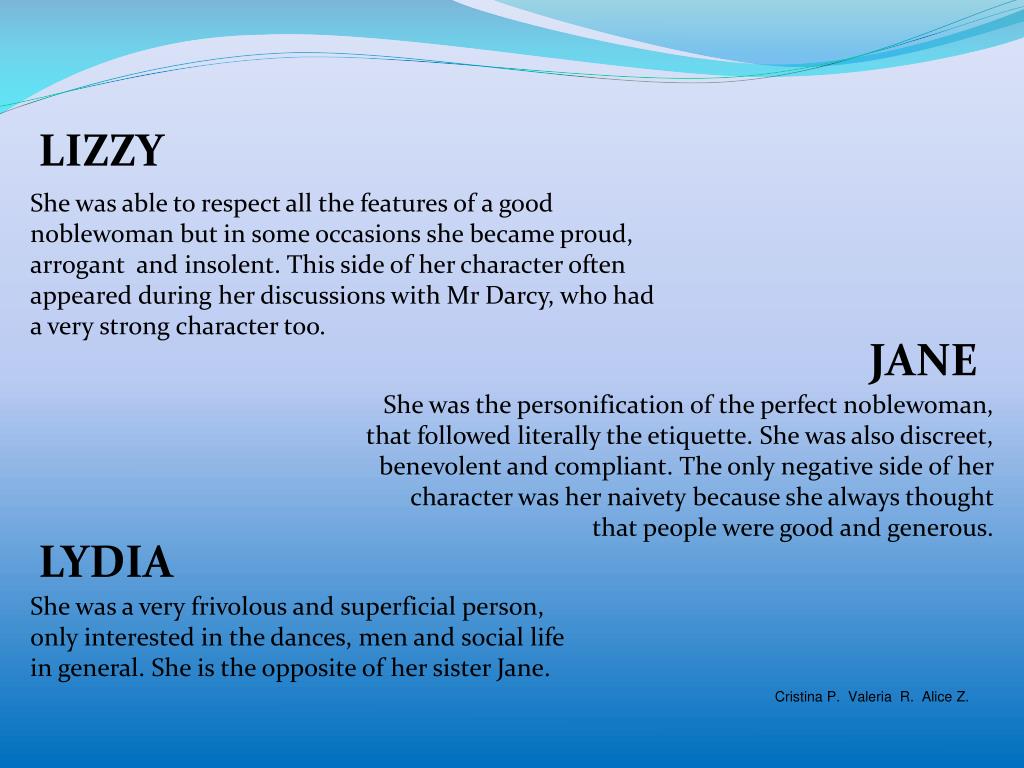 LIZZY She was able to respect all the features of a good noblewoman but in some occasions she became proud, arrogant and insolent. This side of her character often appeared during her discussions with Mr Darcy, who had a very strong character too. JANE She was the personification of the perfect noblewoman, that followed literally the etiquette. She was also discreet, benevolent and compliant. The only negative side of her character was her naivety because she always thought that people were good and generous. LYDIA She was a very frivolous and superficial person, only interested in the dances, men and social life in general. She is the opposite of her sister Jane. Cristina P. Valeria R. Alice Z.