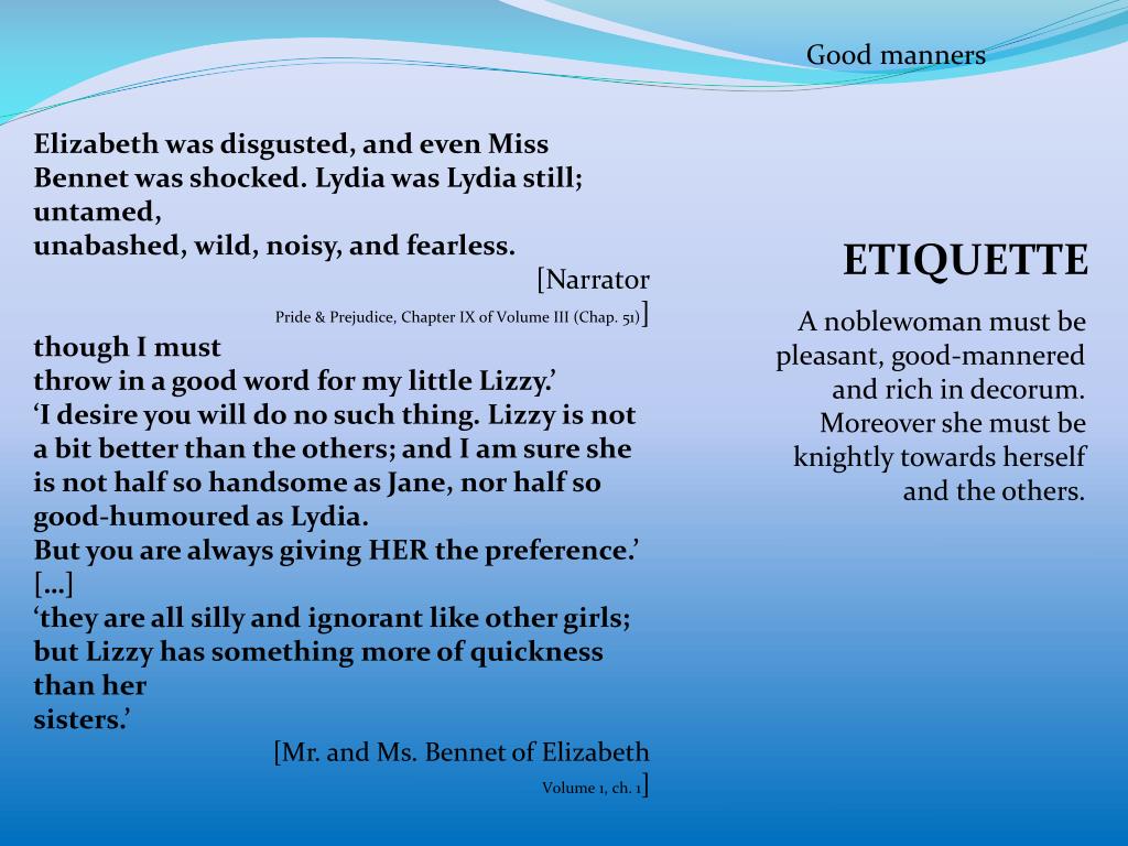 Good manners Elizabeth was disgusted, and even Miss Bennet was shocked. Lydia was Lydia still; untamed, unabashed, wild, noisy, and fearless. [Narrator Pride & Prejudice, Chapter IX of Volume III (Chap. 51)] though I must throw in a good word for my little Lizzy.’ ‘I desire you will do no such thing. Lizzy is not a bit better than the others; and I am sure she is not half so handsome as Jane, nor half so good-humoured as Lydia. But you are always giving HER the preference.’ […] ‘they are all silly and ignorant like other girls; but Lizzy has something more of quickness than her sisters.’ [Mr. and Ms. Bennet of Elizabeth Volume 1, ch. 1] ETIQUETTE A noblewoman must be pleasant, good-mannered and rich in decorum. Moreover she must be knightly towards herself and the others.