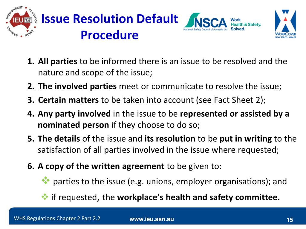 Issue Resolutionunder WHS legislation Issue resolution process applies to unresolved WHS issues PCBUs to consult, create, communicate and utilise issue resolution procedures The default procedure of the WHS Regulations is to be used Where an issue resolution procedure is not in place WHS Regulations Chapter 2 Part 2.2