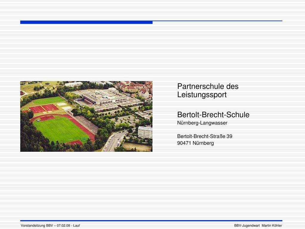 Leistungssport + Schule. Vorstandsitzung BBV – 07.02.08 - Lauf. BBV-Jugendwart Martin Köhler. Partnerschule des Leistungssport Bertolt-Brecht-Schule Nürnberg-Langwasser Bertolt-Brecht-Straße 39 90471 Nürnberg. Vorstandsitzung BBV – 07.02.08 - Lauf. BBV-Jugendwart Martin Köhler.