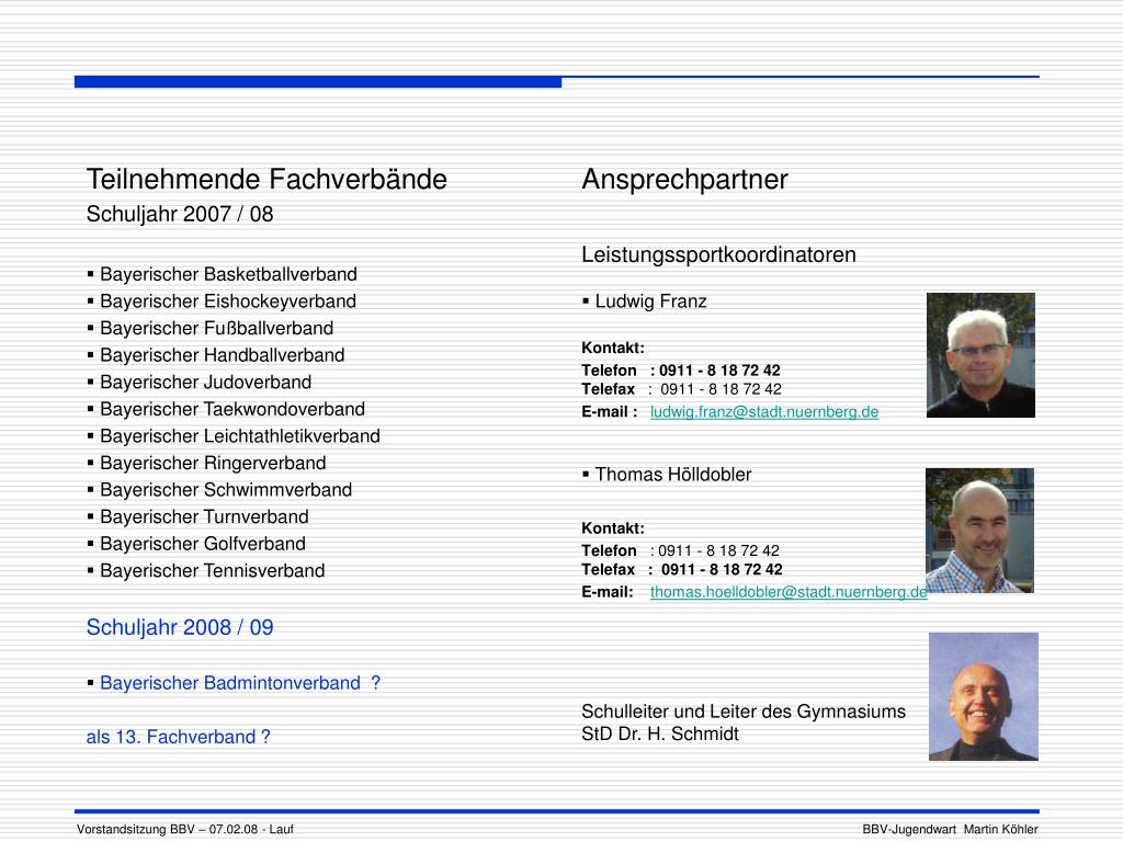 Ansprechpartner • Leistungssportkoordinatoren • Ludwig Franz • Kontakt: • Telefon : 0911 - 8 18 72 42Telefax : 0911 - 8 18 72 42 • E-mail : ludwig.franz@stadt.nuernberg.de • Thomas Hölldobler • Kontakt: • Telefon : 0911 - 8 18 72 42Telefax : 0911 - 8 18 72 42 • E-mail: thomas.hoelldobler@stadt.nuernberg.de • Schulleiter und Leiter des Gymnasiums StD Dr. H. Schmidt Teilnehmende Fachverbände Schuljahr 2007 / 08 Bayerischer Basketballverband Bayerischer Eishockeyverband Bayerischer Fußballverband Bayerischer Handballverband Bayerischer Judoverband Bayerischer Taekwondoverband Bayerischer Leichtathletikverband Bayerischer Ringerverband Bayerischer Schwimmverband Bayerischer Turnverband Bayerischer Golfverband Bayerischer Tennisverband Schuljahr 2008 / 09 Bayerischer Badmintonverband ? als 13. Fachverband ? Vorstandsitzung BBV – 07.02.08 - Lauf BBV-Jugendwart Martin Köhler
