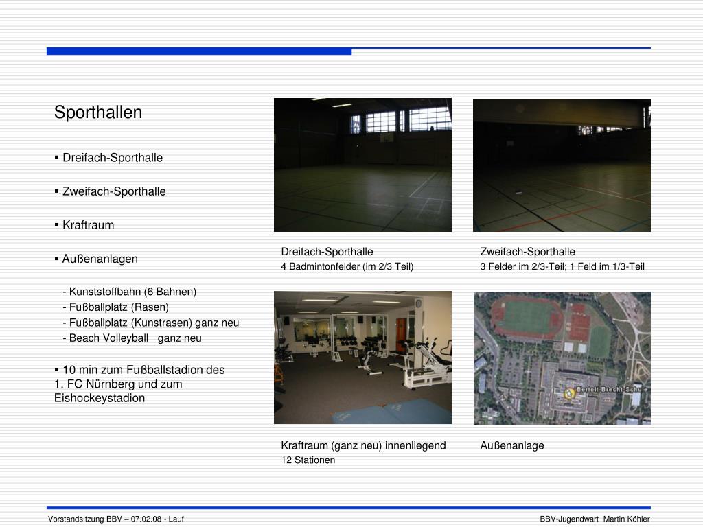 Dreifach-Sporthalle 4 Badmintonfelder (im 2/3 Teil) Zweifach-Sporthalle 3 Felder im 2/3-Teil; 1 Feld im 1/3-Teil Sporthallen Dreifach-Sporthalle Zweifach-Sporthalle Kraftraum Außenanlagen - Kunststoffbahn (6 Bahnen) - Fußballplatz (Rasen) - Fußballplatz (Kunstrasen) ganz neu - Beach Volleyball ganz neu 10 min zum Fußballstadion des 1. FC Nürnberg und zum Eishockeystadion Kraftraum (ganz neu) innenliegend 12 Stationen Außenanlage Vorstandsitzung BBV – 07.02.08 - Lauf BBV-Jugendwart Martin Köhler