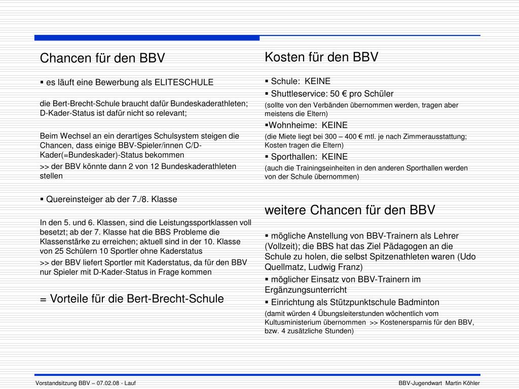 Kosten für den BBV • Schule: KEINE • Shuttleservice: 50 € pro Schüler (sollte von den Verbänden übernommen werden, tragen aber meistens die Eltern) • Wohnheime: KEINE (die Miete liegt bei 300 – 400 € mtl. je nach Zimmerausstattung; Kosten tragen die Eltern) • Sporthallen: KEINE (auch die Trainingseinheiten in den anderen Sporthallen werden von der Schule übernommen) weitere Chancen für den BBV • mögliche Anstellung von BBV-Trainern als Lehrer (Vollzeit); die BBS hat das Ziel Pädagogen an die Schule zu holen, die selbst Spitzenathleten waren (Udo Quellmatz, Ludwig Franz) • möglicher Einsatz von BBV-Trainern im Ergänzungsunterricht • Einrichtung als Stützpunktschule Badminton (damit würden 4 Übungsleiterstunden wöchentlich vom Kultusministerium übernommen >> Kostenersparnis für den BBV, bzw. 4 zusätzliche Stunden) • Chancen für den BBV • es läuft eine Bewerbung als ELITESCHULE die Bert-Brecht-Schule braucht dafür Bundeskaderathleten; D-Kader-Status ist dafür nicht so relevant; Beim Wechsel an ein derartiges Schulsystem steigen die Chancen, dass einige BBV-Spieler/innen C/D-Kader(=Bundeskader)-Status bekommen >> der BBV könnte dann 2 von 12 Bundeskaderathleten stellen • Quereinsteiger ab der 7./8. Klasse In den 5. und 6. Klassen, sind die Leistungssportklassen voll besetzt; ab der 7. Klasse hat die BBS Probleme die Klassenstärke zu erreichen; aktuell sind in der 10. Klasse von 25 Schülern 10 Sportler ohne Kaderstatus >> der BBV liefert Sportler mit Kaderstatus, da für den BBV nur Spieler mit D-Kader-Status in Frage kommen = Vorteile für die Bert-Brecht-Schule Vorstandsitzung BBV – 07.02.08 - Lauf BBV-Jugendwart Martin Köhler