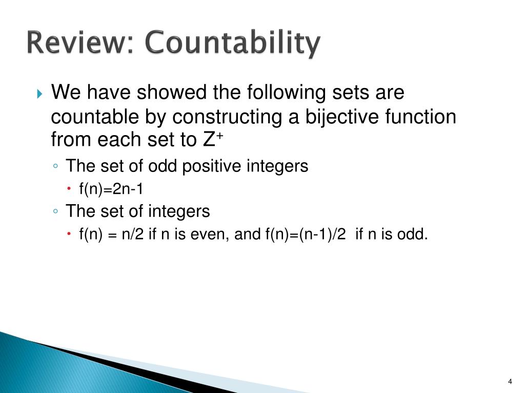 Review: Countability • We have showed the following sets are countable by constructing a bijective function from each set to Z⁺ • The set of odd positive integers • f(n)=2n-1 • The set of integers • f(n) = n/2 if n is even, and f(n)=(n-1)/2 if n is odd.