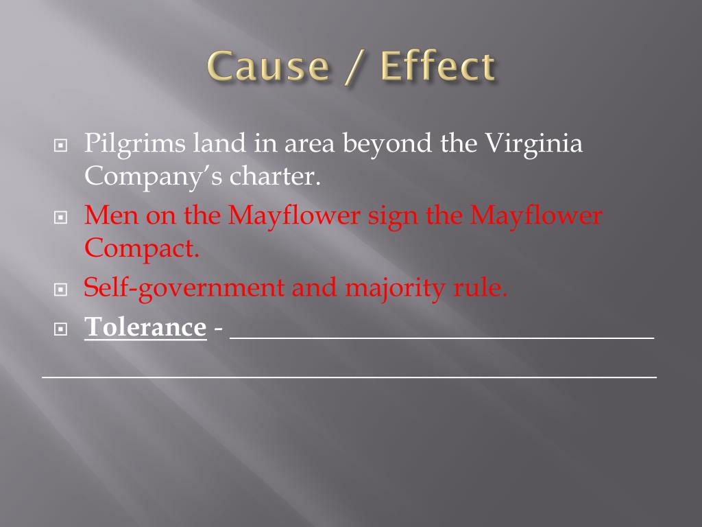 Cause / Effect • Pilgrims land in area beyond the Virginia Company’s charter. • Men on the Mayflower sign the Mayflower Compact. • Self-government and majority rule. • Tolerance - _______________________________ _____________________________________________