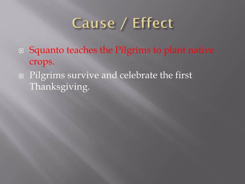 Cause / Effect • Squanto teaches the Pilgrims to plant native crops. • Pilgrims survive and celebrate the first Thanksgiving.