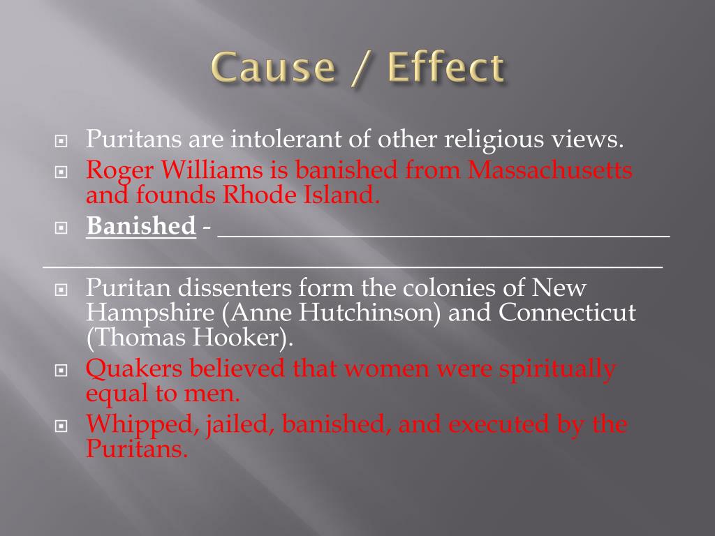 Cause / Effect • Puritans are intolerant of other religious views. • Roger Williams is banished from Massachusetts and founds Rhode Island. • Banished - ___________________________________ ________________________________________________ • Puritan dissenters form the colonies of New Hampshire (Anne Hutchinson) and Connecticut (Thomas Hooker). • Quakers believed that women were spiritually equal to men. • Whipped, jailed, banished, and executed by the Puritans.