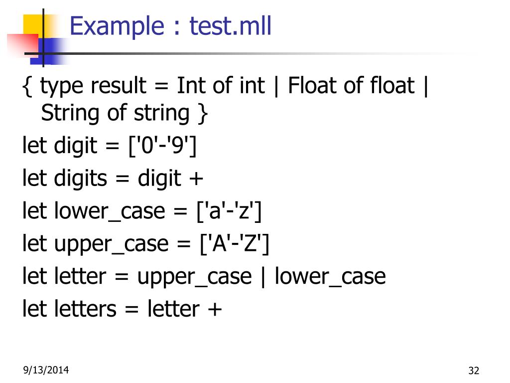Example : test.mll { type result = Int of int | Float of float | String of string } let digit = ['0'-'9'] let digits = digit + let lower_case = ['a'-'z'] let upper_case = ['A'-'Z'] let letter = upper_case | lower_case let letters = letter +
