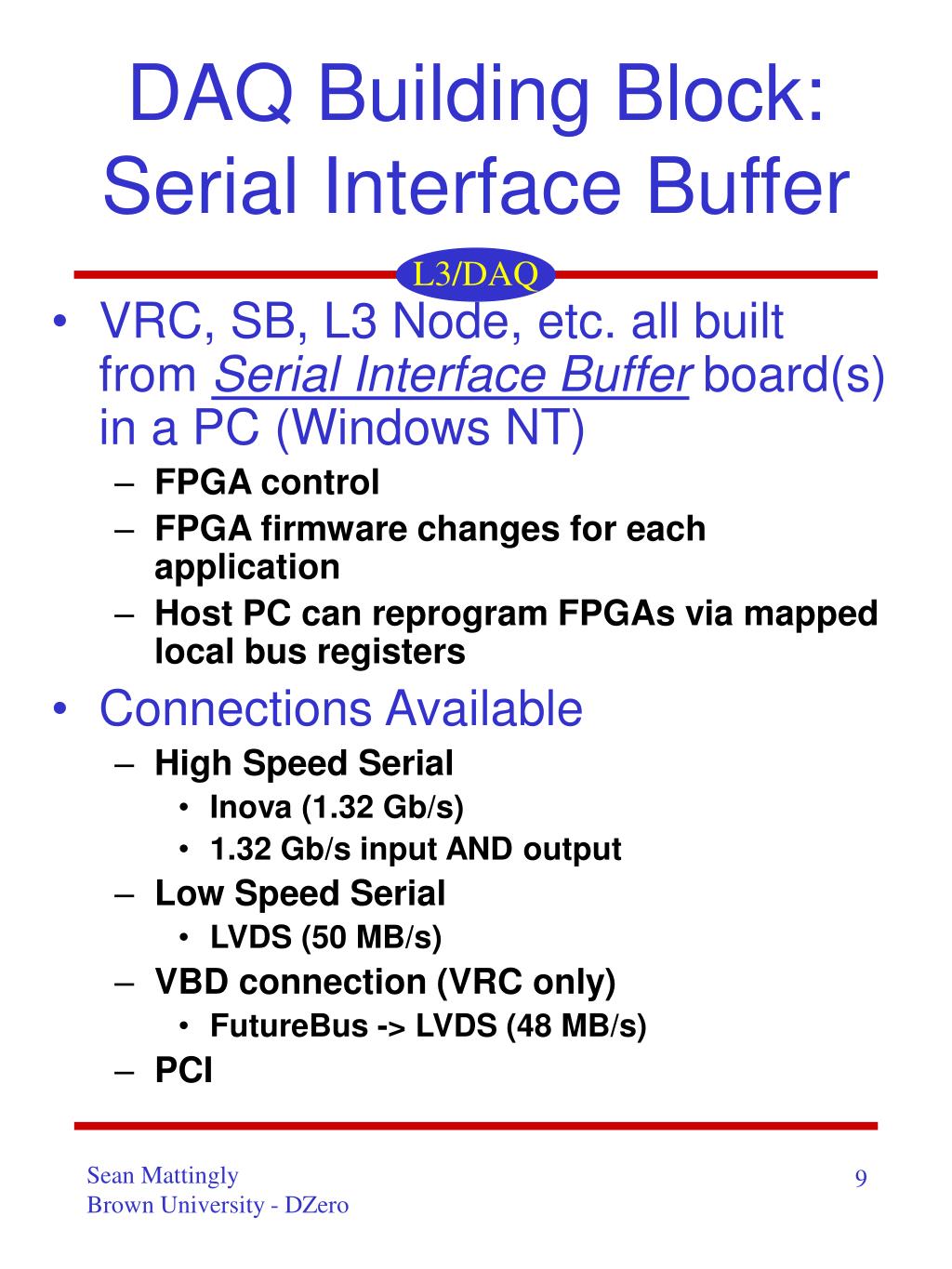 DAQ Building Block:Serial Interface Buffer • VRC, SB, L3 Node, etc. all built from Serial Interface Buffer board(s) in a PC (Windows NT) • FPGA control • FPGA firmware changes for each application • Host PC can reprogram FPGAs via mapped local bus registers • Connections Available • High Speed Serial • Inova (1.32 Gb/s) • 1.32 Gb/s input AND output • Low Speed Serial • LVDS (50 MB/s) • VBD connection (VRC only) • FutureBus -> LVDS (48 MB/s) • PCI Sean Mattingly Brown University - DZero