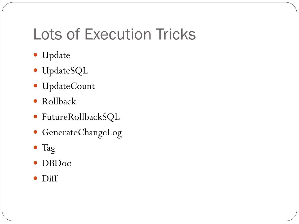 Lots of Execution Tricks • Update • UpdateSQL • UpdateCount • Rollback • FutureRollbackSQL • GenerateChangeLog • Tag • DBDoc • Diff