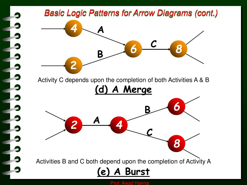 Basic Logic Patterns for Arrow Diagrams (cont.) 4 A C 6 8 B 2 Activity C depends upon the completion of both Activities A & B (d) A Merge 6 B A 2 4 C 8 Activities B and C both depend upon the completion of Activity A (e) A Burst Prof. Awad Hanna