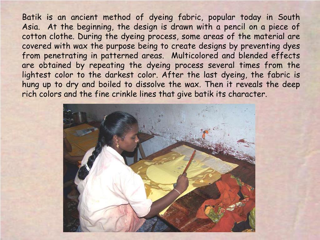 Batik is an ancient method of dyeing fabric, popular today in South Asia. At the beginning, the design is drawn with a pencil on a piece of cotton clothe. During the dyeing process, some areas of the material are covered with wax the purpose being to create designs by preventing dyes from penetrating in patterned areas. Multicolored and blended effects are obtained by repeating the dyeing process several times from the lightest color to the darkest color. After the last dyeing, the fabric is hung up to dry and boiled to dissolve the wax. Then it reveals the deep rich colors and the fine crinkle lines that give batik its character.