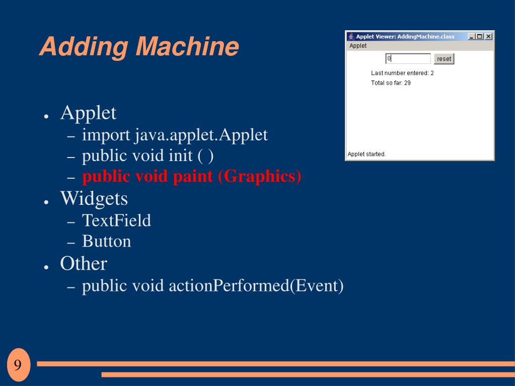 Adding Machine • public void init( ) • Called whenever starting an applet • HTML code: <applet code=“AddingMachine.class” width=300 height=200></applet> • Set up objects • If have additional parameters to retrieve from HTML code to Applet Inside <applet ...> and </applet>, for each parameter put <param name="your_param_name" value="your_value"> 8