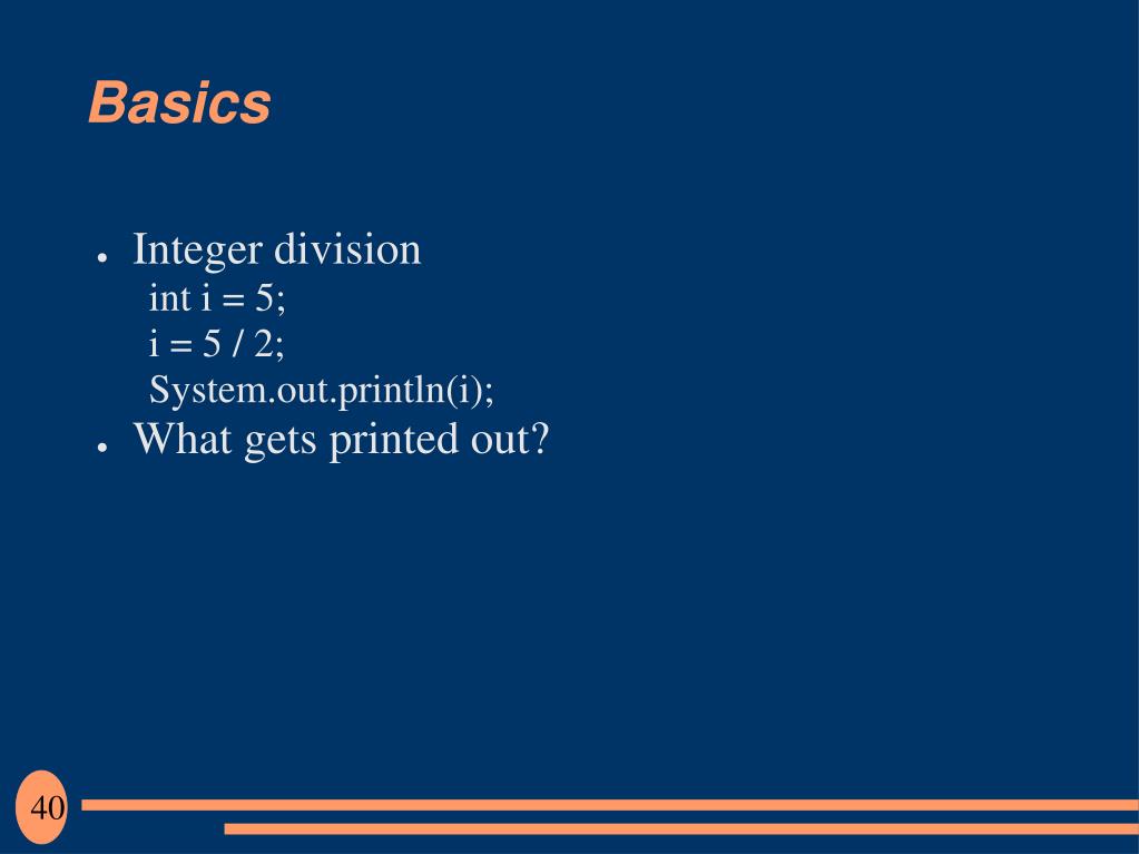 Basics • Integer division int i = 5; i = 5 / 2; System.out.println(i); • What gets printed out? 40