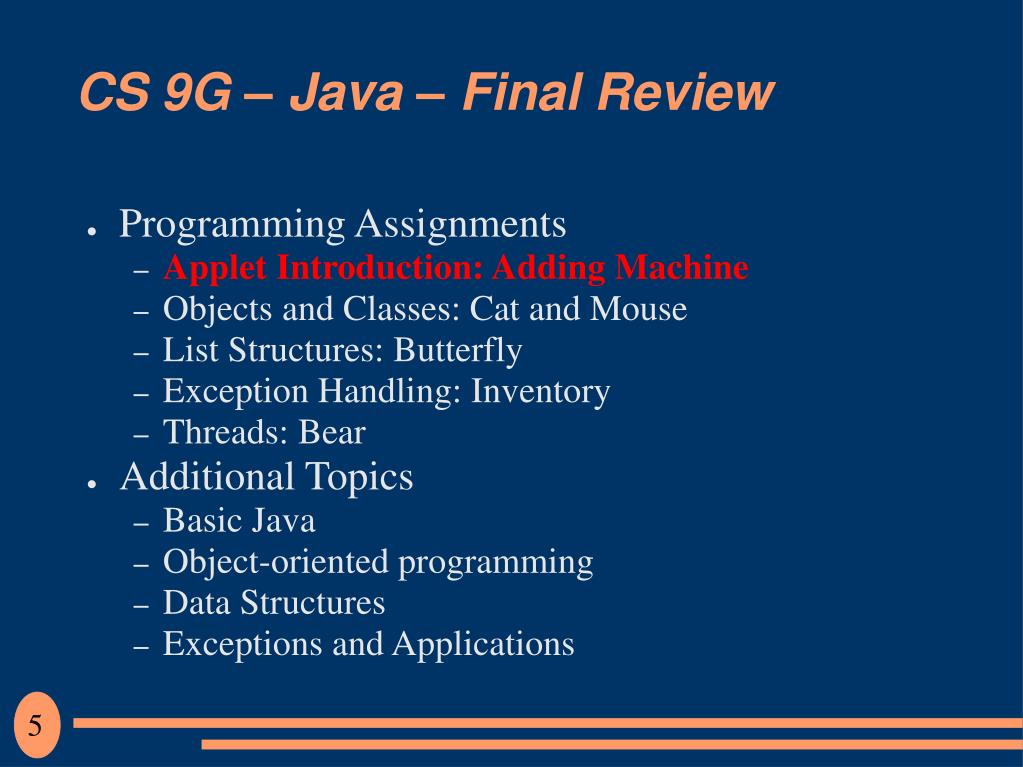 CS 9G – Java – Final Review • Programming Assignments • Applet Introduction: Adding Machine • Objects and Classes: Cat and Mouse • List Structures: Butterfly • Exception Handling: Inventory • Threads: Bear • Additional Topics • Basic Java • Object-oriented programming • Data Structures • Exceptions and Applications 4