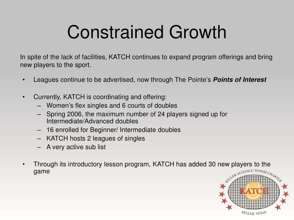 Constrained Growth In spite of the lack of facilities, KATCH continues to expand program offerings and bring new players to the sport. • Leagues continue to be advertised, now through The Pointe’s Points of Interest • Currently, KATCH is coordinating and offering: • Women’s flex singles and 6 courts of doubles • Spring 2006, the maximum number of 24 players signed up for Intermediate/Advanced doubles • 16 enrolled for Beginner/ Intermediate doubles • KATCH hosts 2 leagues of singles • A very active sub list • Through its introductory lesson program, KATCH has added 30 new players to the game