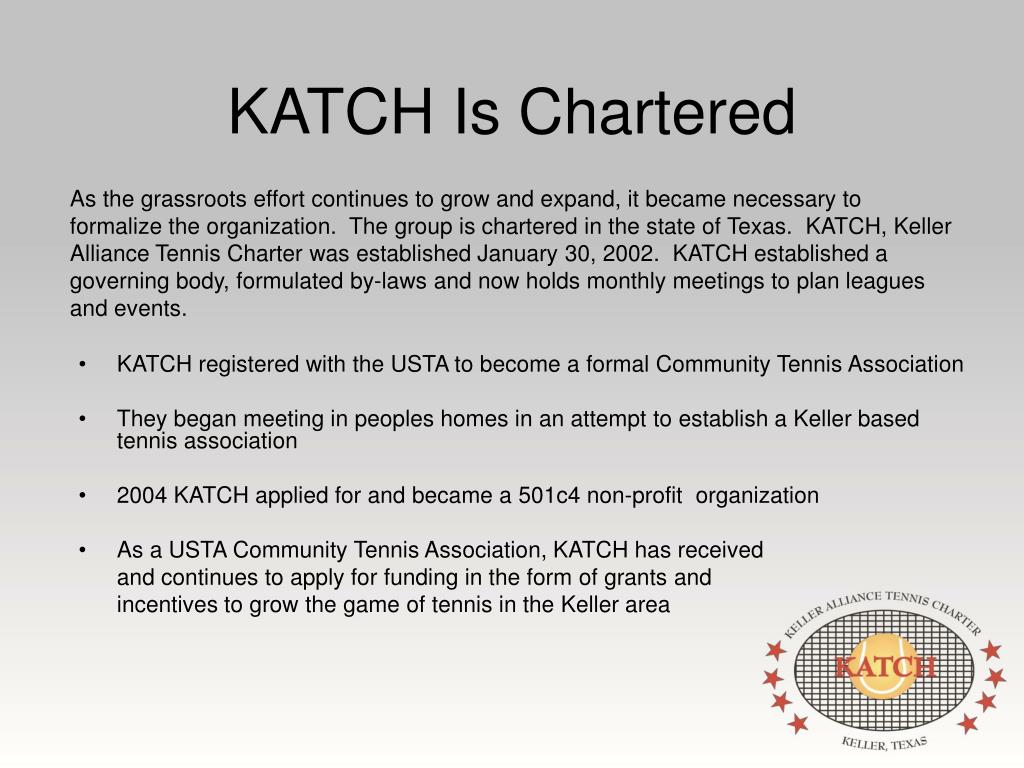 KATCH Is Chartered As the grassroots effort continues to grow and expand, it became necessary to formalize the organization. The group is chartered in the state of Texas. KATCH, Keller Alliance Tennis Charter was established January 30, 2002. KATCH established a governing body, formulated by-laws and now holds monthly meetings to plan leagues and events. • KATCH registered with the USTA to become a formal Community Tennis Association • They began meeting in peoples homes in an attempt to establish a Keller based tennis association • 2004 KATCH applied for and became a 501c4 non-profit organization • As a USTA Community Tennis Association, KATCH has received and continues to apply for funding in the form of grants and incentives to grow the game of tennis in the Keller area