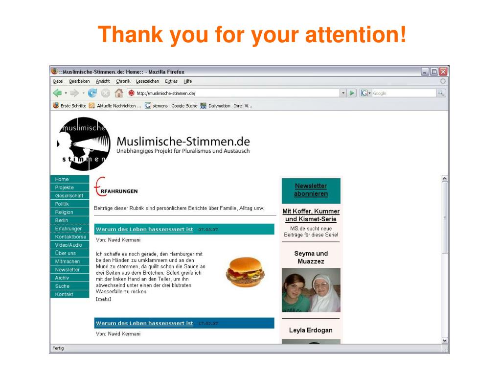 Users and feedbacks • Users ? But increasing number of journalists, politicians and association representatives are subscribing to the newsletter • Feedbacks • Positive: Journalists, German foundations • 2 prizes: Bündnis für Demokratie und Toleranz, Startsocial 2006. • Almost no reaction from Muslim organisations, at least not officially (but no active communication in their direction)
