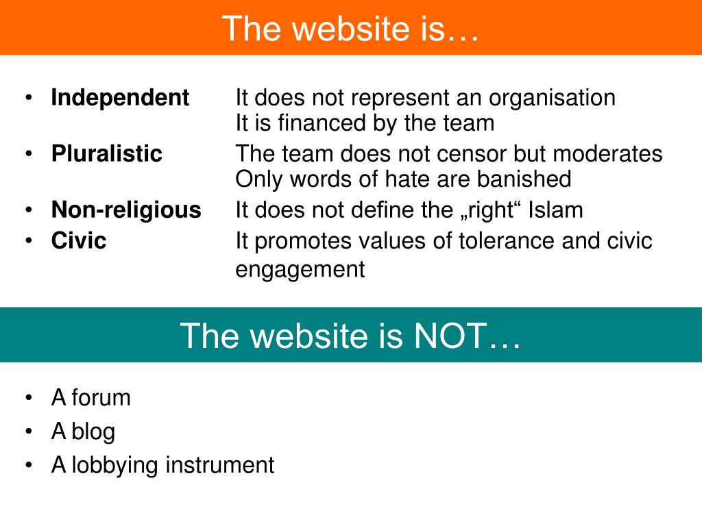 The website is… • Independent It does not represent an organisation It is financed by the team • Pluralistic The team does not censor but moderates Only words of hate are banished • Non-religious It does not define the „right“ Islam • Civic It promotes values of tolerance and civic engagement The website is NOT… • A forum • A blog • A lobbying instrument