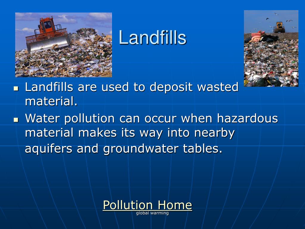 Landfills • Landfills are used to deposit wasted material. • Water pollution can occur when hazardous material makes its way into nearby aquifers and groundwater tables. Pollution Home global warming