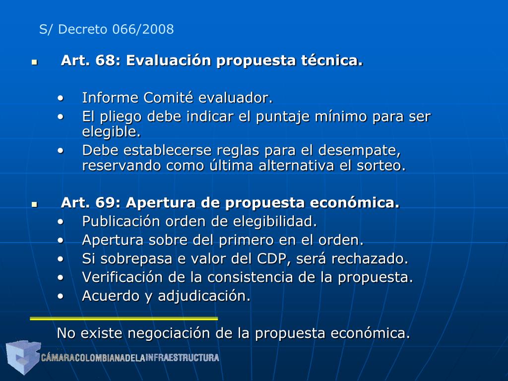 S/ Decreto 066/2008 • Art. 68: Evaluación propuesta técnica. • Informe Comité evaluador. • El pliego debe indicar el puntaje mínimo para ser elegible. • Debe establecerse reglas para el desempate, reservando como última alternativa el sorteo. • Art. 69: Apertura de propuesta económica. • Publicación orden de elegibilidad. • Apertura sobre del primero en el orden. • Si sobrepasa e valor del CDP, será rechazado. • Verificación de la consistencia de la propuesta. • Acuerdo y adjudicación. No existe negociación de la propuesta económica.