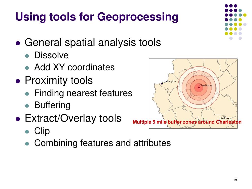 Using tools for Geoprocessing • General spatial analysis tools • Dissolve • Add XY coordinates • Proximity tools • Finding nearest features • Buffering • Extract/Overlay tools • Clip • Combining features and attributes Multiple 5 mile buffer zones around Charleston