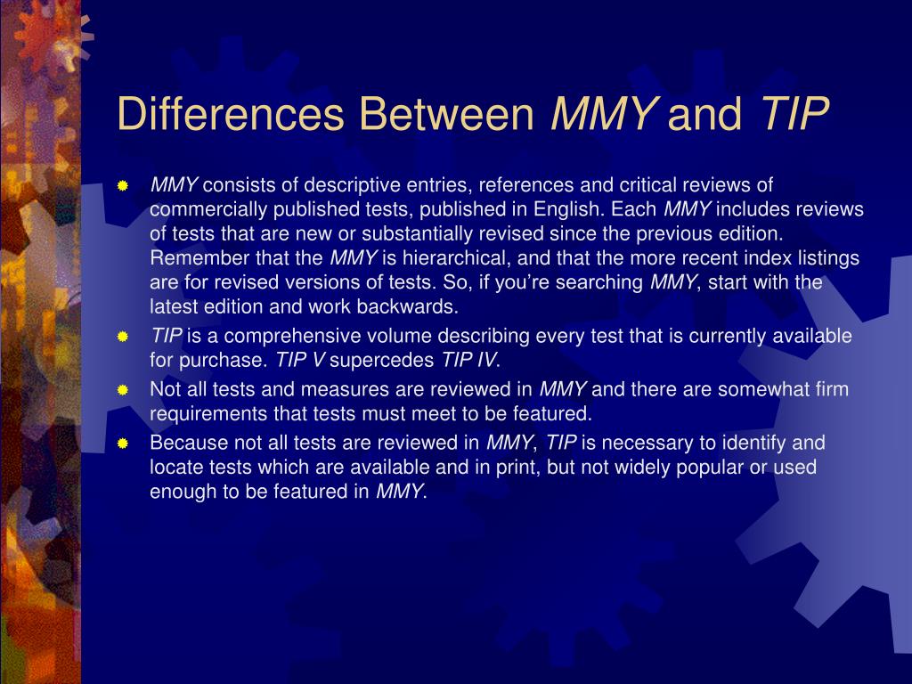 Differences Between MMY and TIP • MMY consists of descriptive entries, references and critical reviews of commercially published tests, published in English. Each MMY includes reviews of tests that are new or substantially revised since the previous edition. Remember that the MMY is hierarchical, and that the more recent index listings are for revised versions of tests. So, if you’re searching MMY, start with the latest edition and work backwards. • TIP is a comprehensive volume describing every test that is currently available for purchase. TIP V supercedes TIP IV. • Not all tests and measures are reviewed in MMY and there are somewhat firm requirements that tests must meet to be featured. • Because not all tests are reviewed in MMY, TIP is necessary to identify and locate tests which are available and in print, but not widely popular or used enough to be featured in MMY.