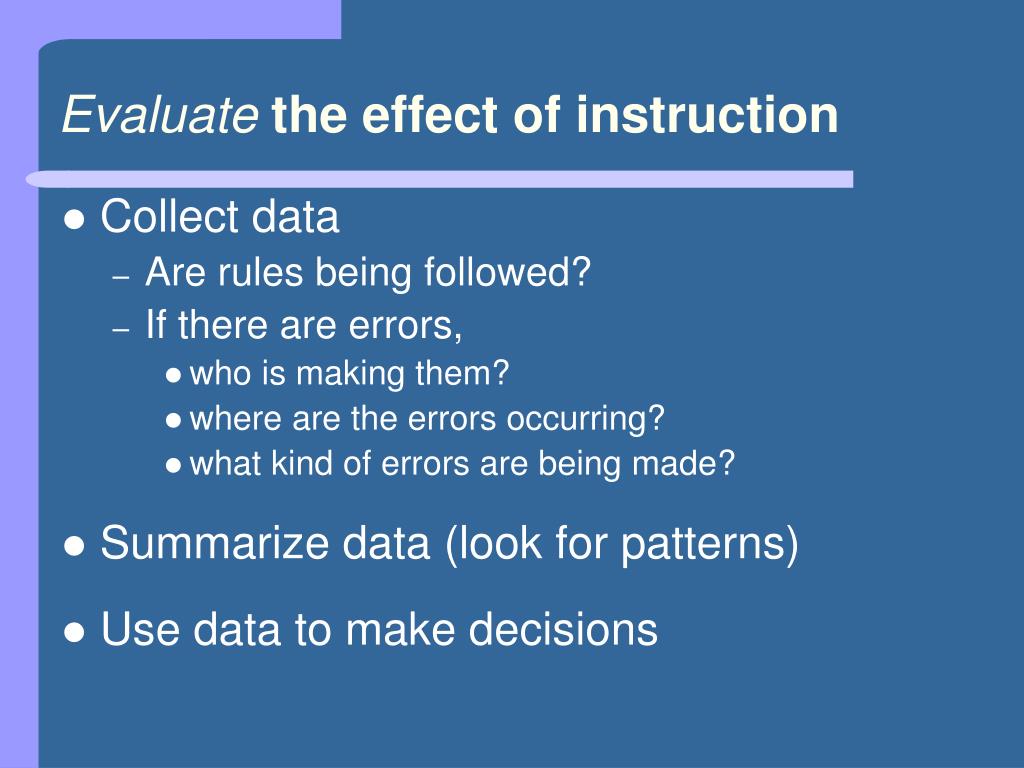 Evaluate the effect of instruction • Collect data • Are rules being followed? • If there are errors, • who is making them? • where are the errors occurring? • what kind of errors are being made? • Summarize data (look for patterns) • Use data to make decisions