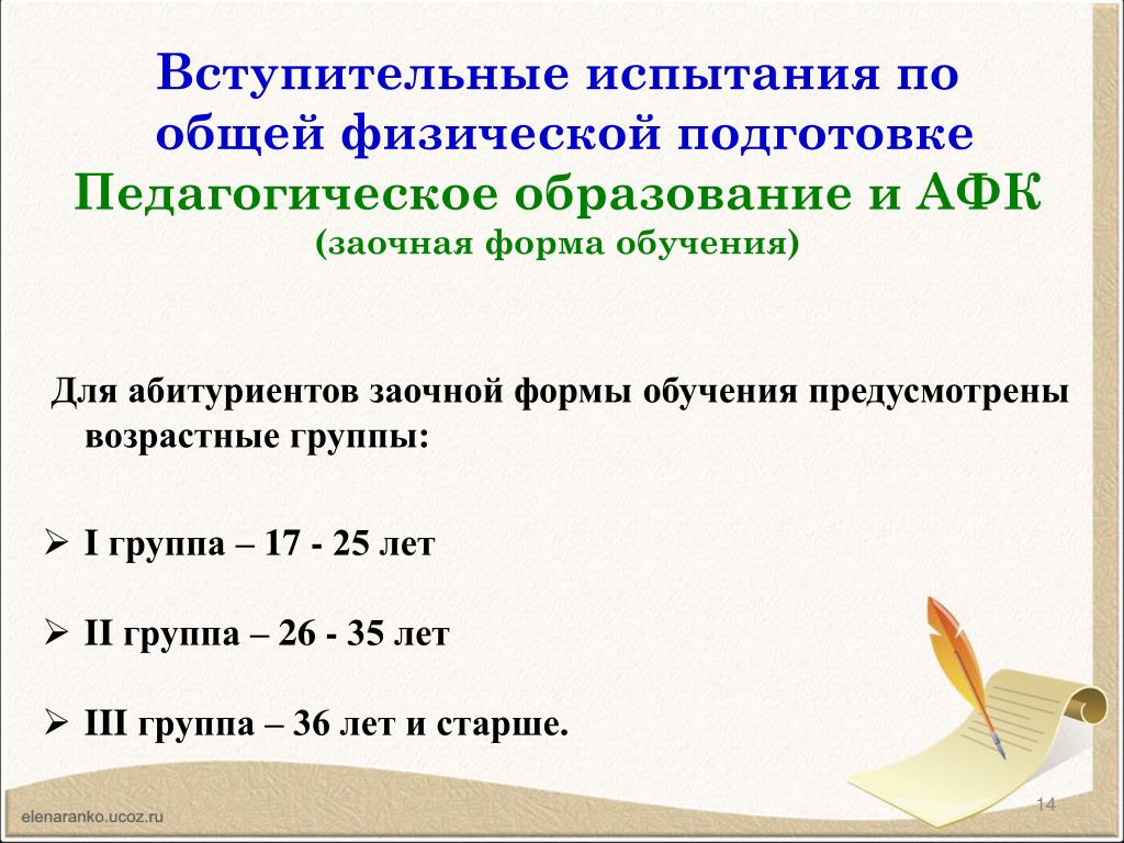 Вступительные испытания по общей физической подготовкеПедагогическое образование и АФК(заочная форма обучения) Для абитуриентов заочной формы обучения предусмотрены возрастные группы: • I группа – 17 - 25 лет • II группа – 26 - 35 лет • III группа – 36 лет и старше.