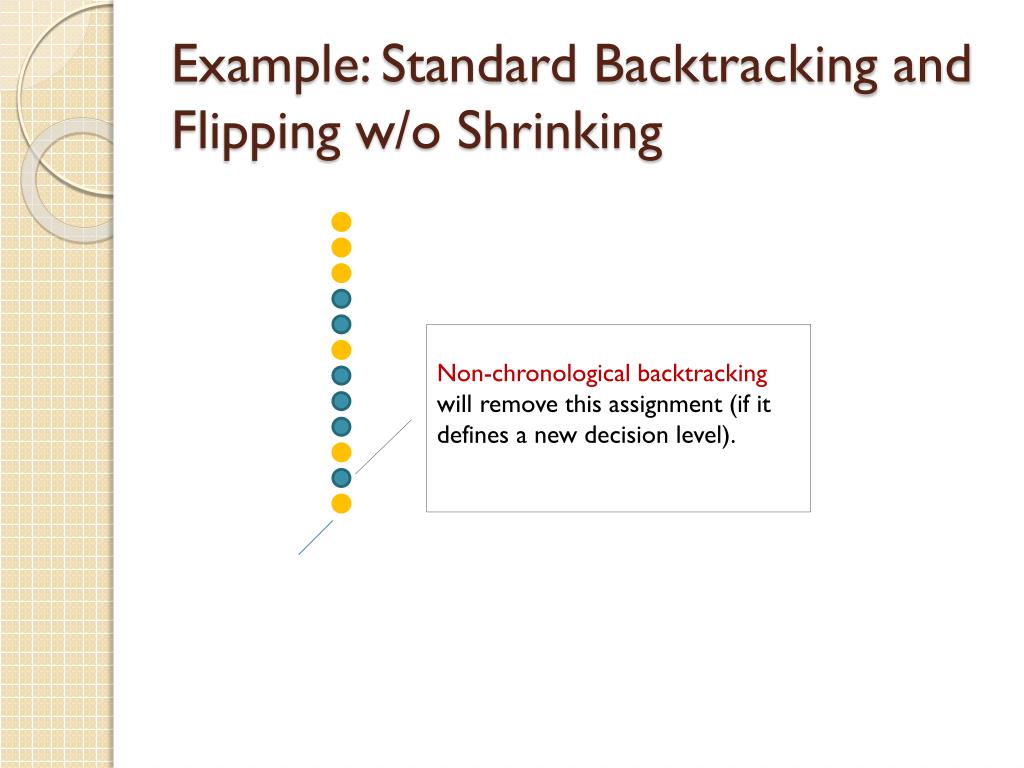 Example: Standard Backtracking and Flipping w/o Shrinking Backtrack! Non-chronological backtracking removed an assignment.