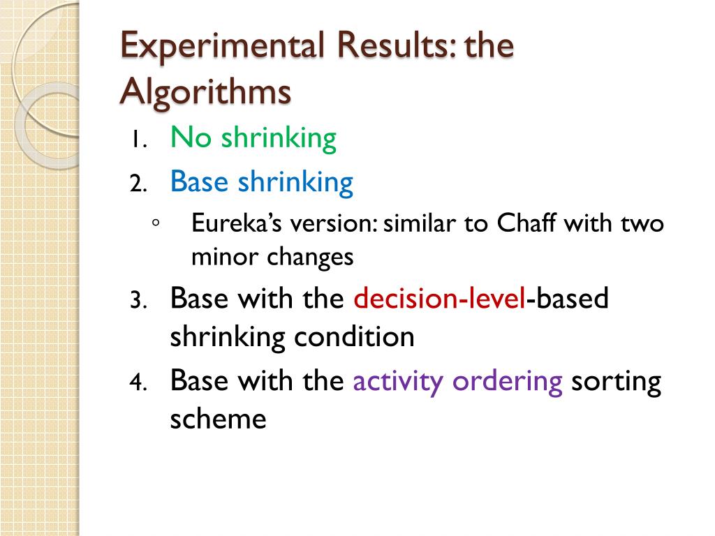 Experimental Results: the Algorithms • No shrinking • Base shrinking • Eureka’s version: similar to Chaff with two minor changes • Base with the decision-level-based shrinking condition • Base with the activity ordering sorting scheme
